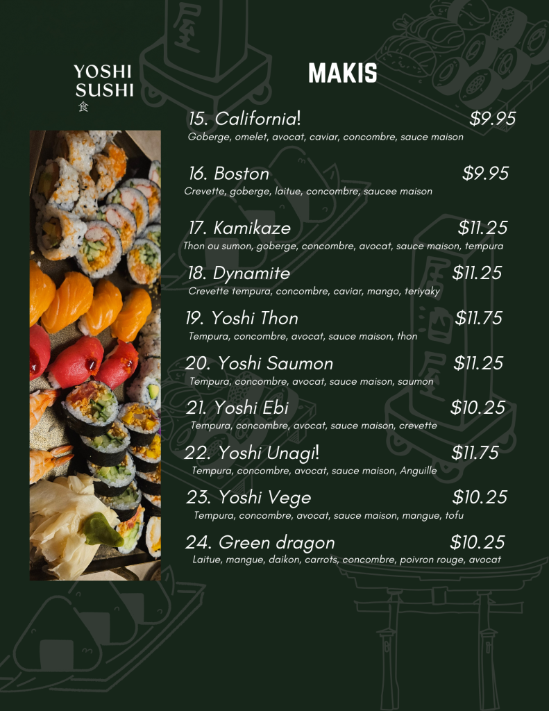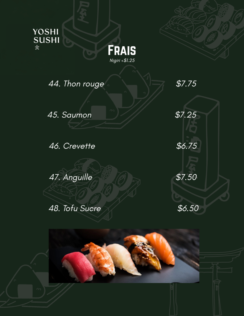 La satisfaction du client est la force motrice qui pousse Yoshi Sushi à développer et à proposer des plats toujours plus délicieux.
