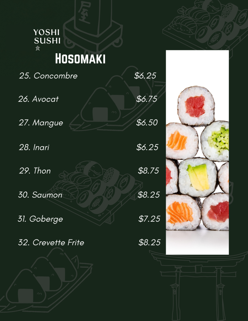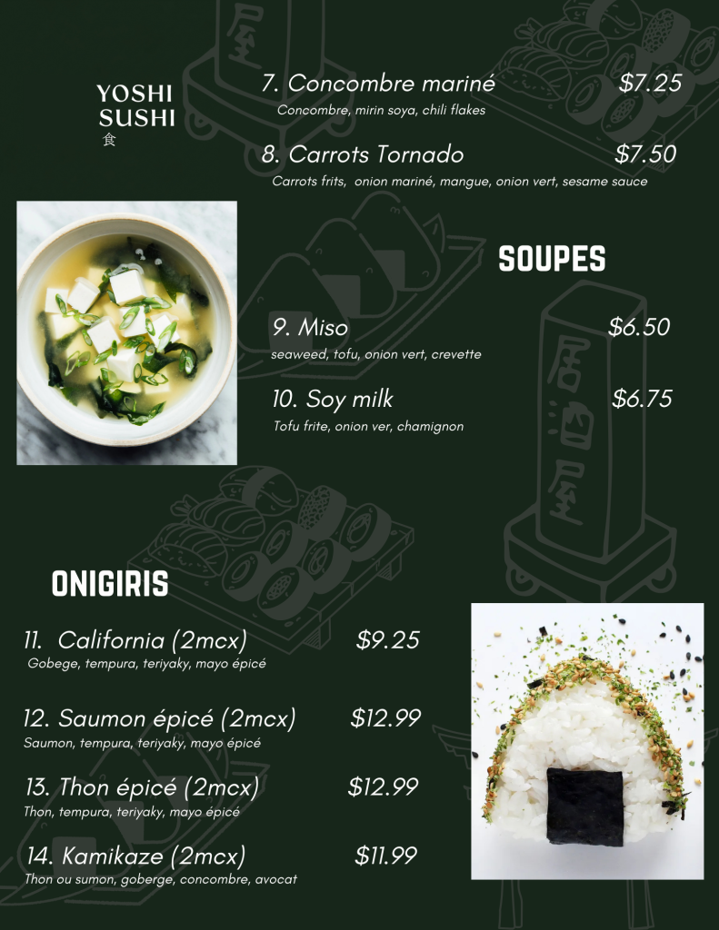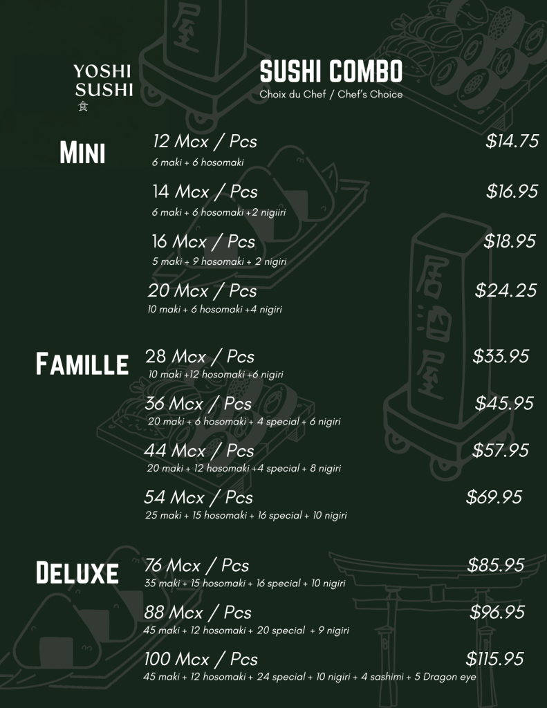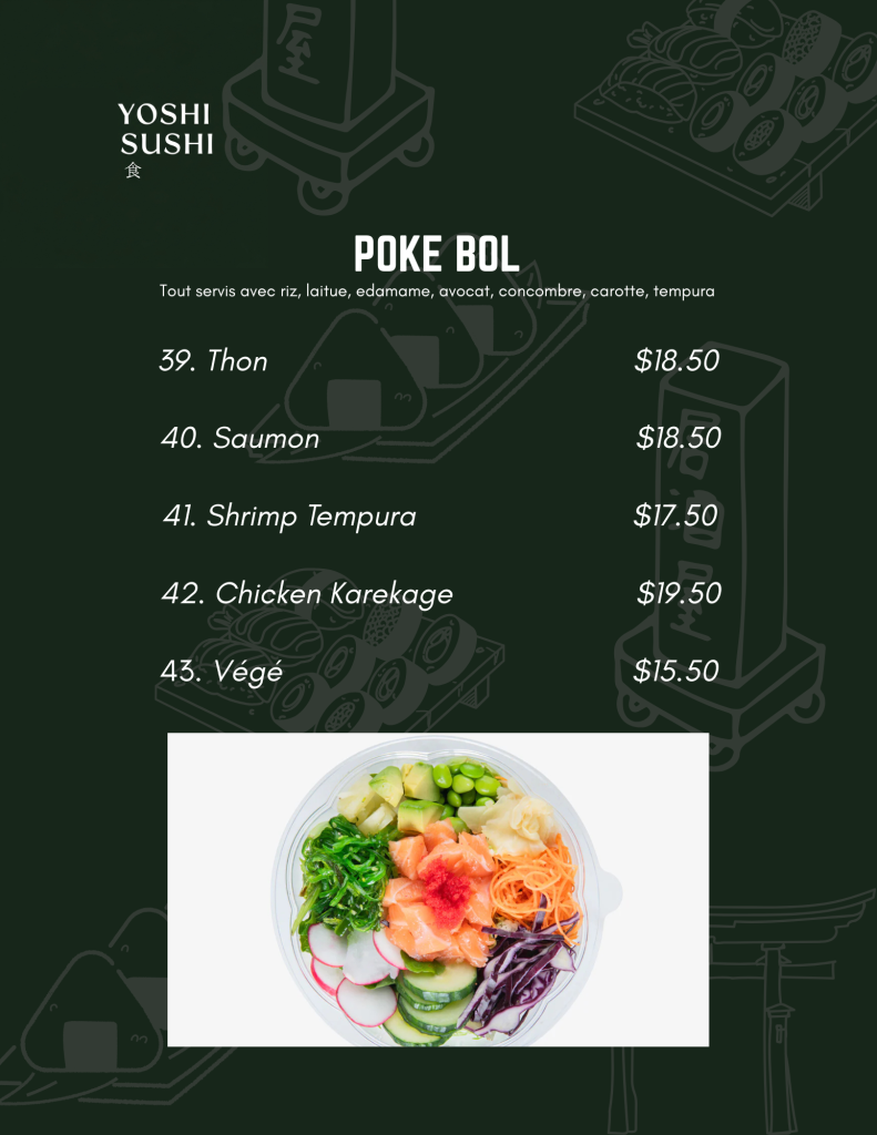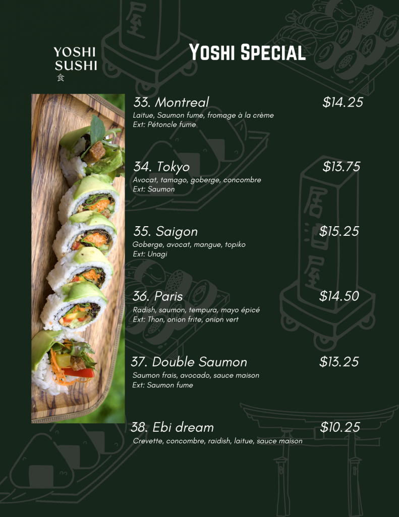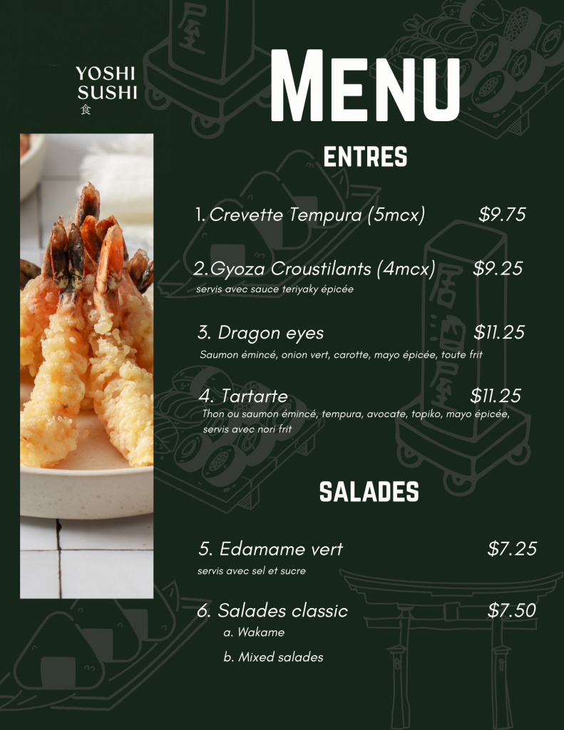 « Sushi – Une cuisine qui touche les émotions » : tel est le message et la mission de Yoshi Sushi. Yoshi Sushi vous invite à découvrir ses plats, adaptés à tous les goûts : fruits de mer, végétariens, ou même amateurs de tempura. Profitez de notre cuisine pour créer des souvenirs inoubliables et partager des moments inoubliables avec vos amis et votre famille ! Bon appétit !